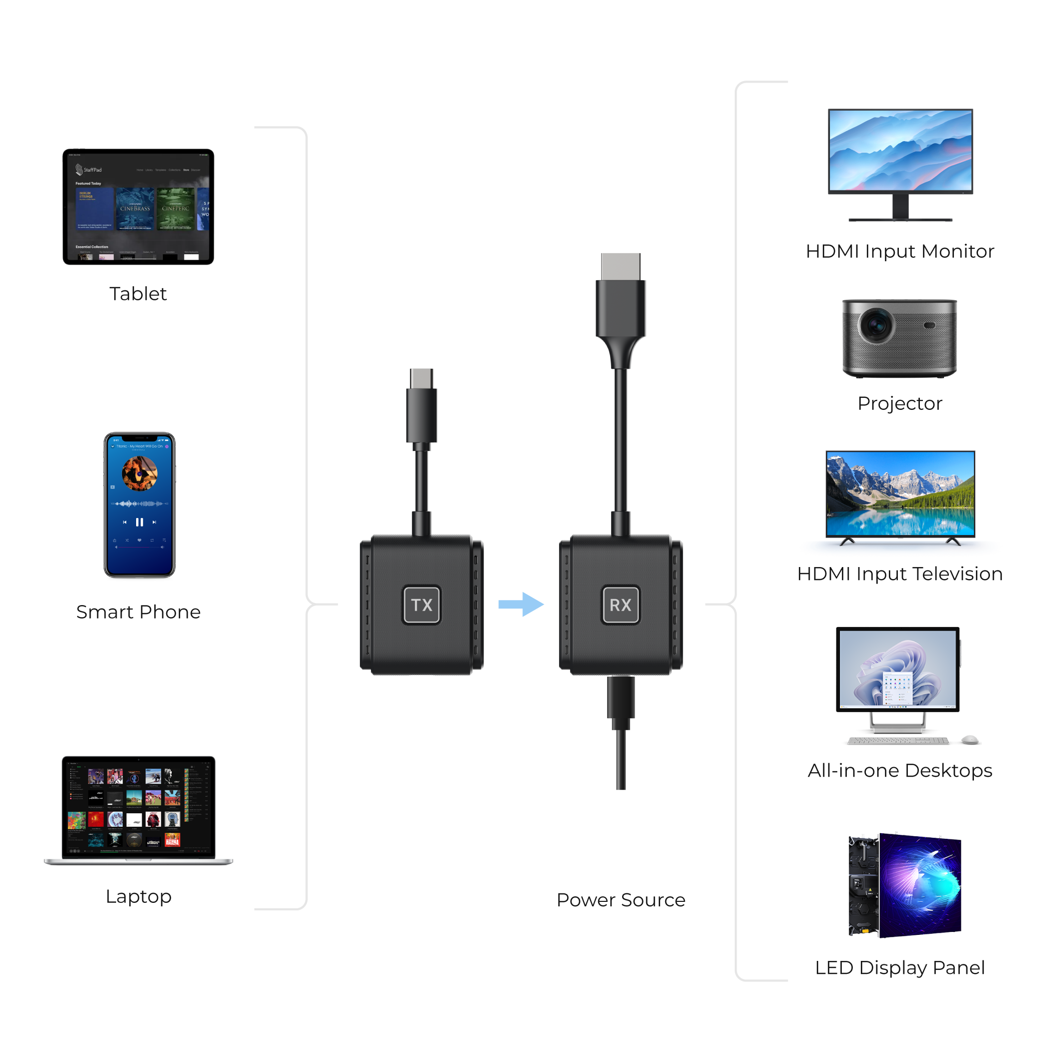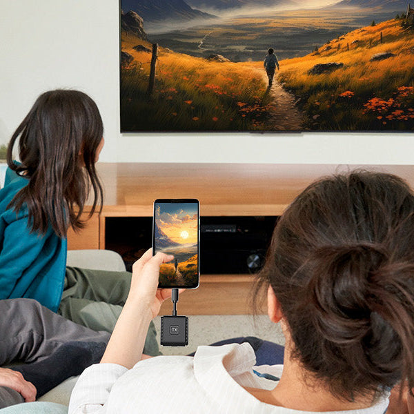 With just simply one plug in the device and power on, screen automatically mirroring. Works on almost every device that has HDMI port.