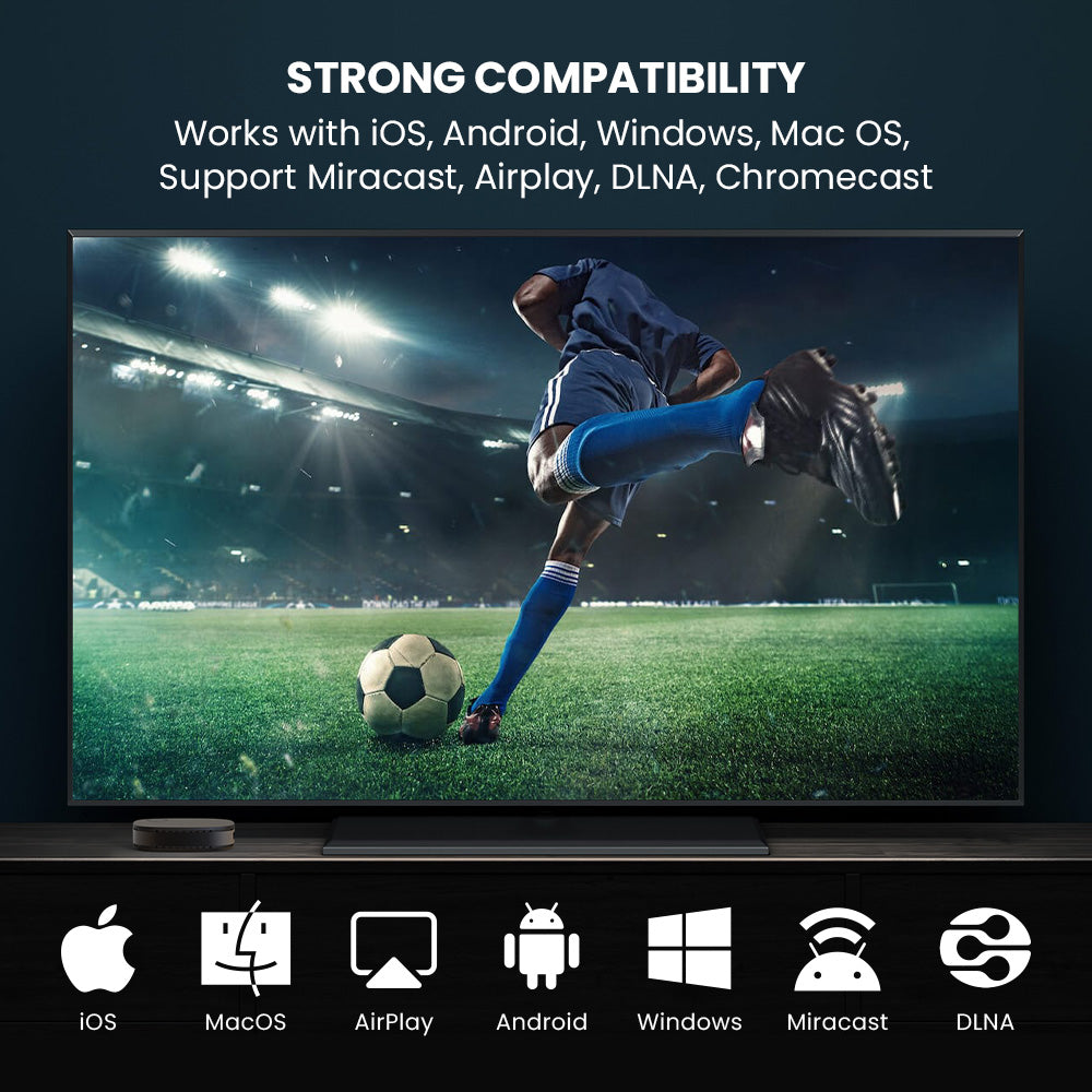 • Wide Compatibility: Support Miracast, Airplay, and DLNA. Compatible with Android, macOS, iOS, Windows, and ChromeOS.